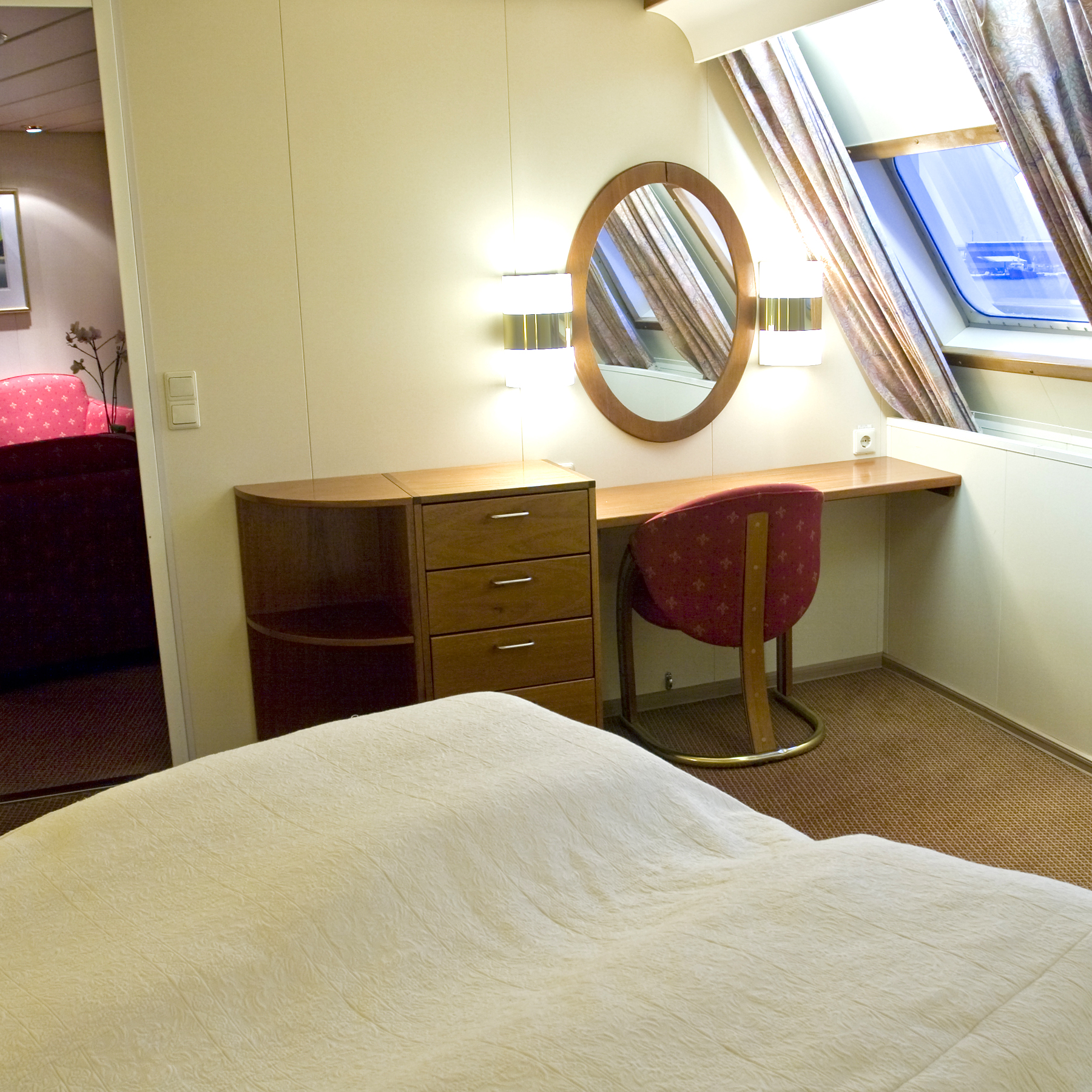 Mini suite on upper deck for up to 4 people. The suite comes with a double bed and sofa bed, full view, minibar and TV. Please note that we have wheelchair accessible cabins within this category, please contact us to book one of these cabins.