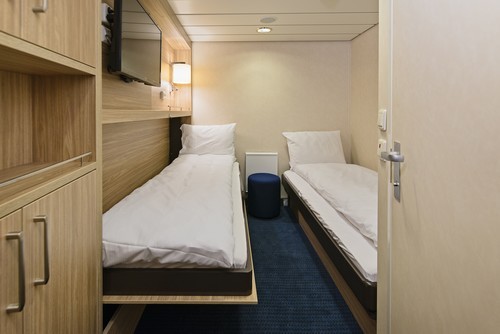 Wheelchair accessible rooms for up to two people with wider door, accessible WC and adjusted bed. The cabins are situated on lower decks and have separate beds with one sofa. All have TV, extra chair, and window with full view.