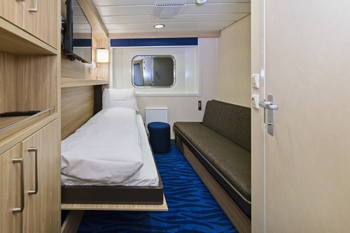These standard inside cabins for up to two people on the upper and lower decks have separate beds, one of which doubles as a sofa, and a TV. None of the cabins have windows.